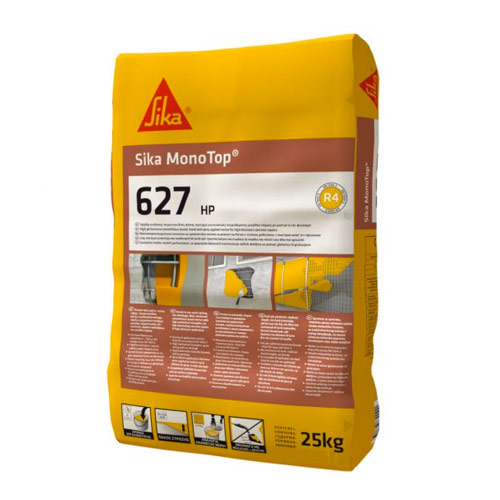 Το Sika MonoTop®-627 HP είναι έτοιμο προς χρήση, ταχείας πήξης, περιορισμένης συρρίκνωσης, τσιμεντοειδούς βάσης επισκευαστικό κονίαμα ινοπλισμένο με ειδικές συνθετικές μικροΐνες για επισκευές σκυροδέματος μεγάλου πάχους και αυξημένων απαιτήσεων, είτε με το χέρι, είτε με ψεκασμό, που πληροί τις απαιτήσεις τάξεως R4 σύμφωνα με ΕΝ 1504-3.